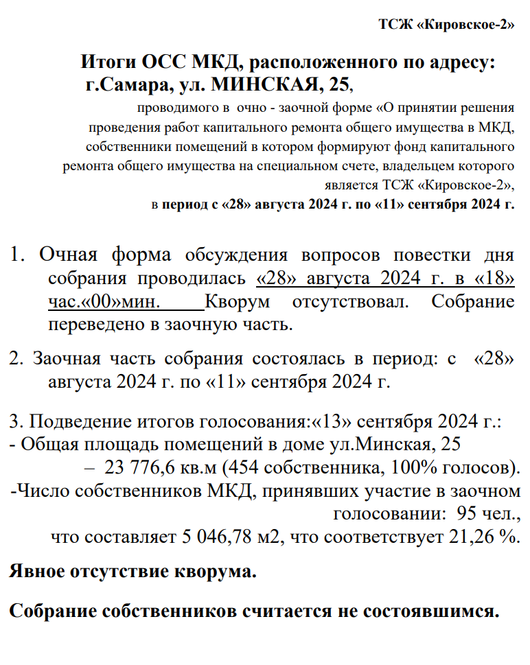 общее собрание собственников МКД, расположенного по адресу: г.Самара, ул. МИНСКАЯ, 25,
